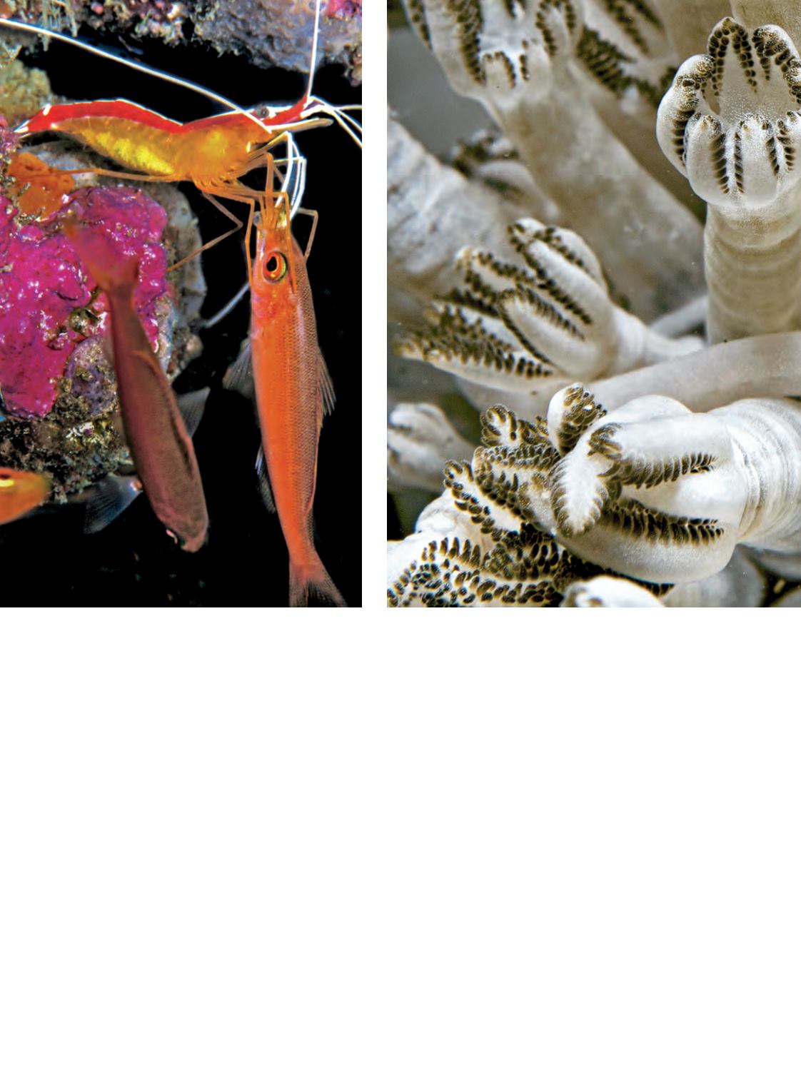 From left: A cleaner shrimp extends its claws inside the tiny mouth of a plankton-picking fusilier to extract parasites for dinner.